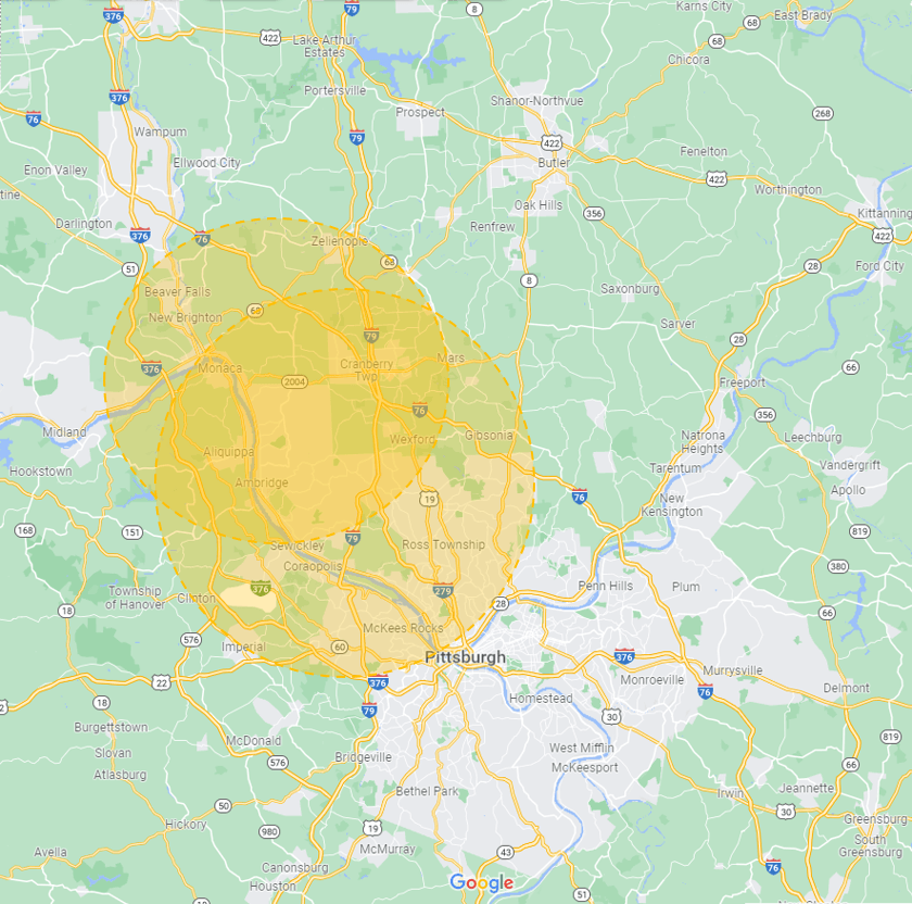 Serving: Greater Pittsburgh, Aleppo, Aliquippa, Center Township, Coraopolis, Ambridge, Avalon, Beaver, Beaver Falls, Bellevue, Ben Avon, Bridgeville, Brighton Heights, Carnegie, Cranberry Township, Emsworth, Franklin Park, Freedom, Gibsonia, Heidelberg, Ingomar, Kilbuck Township, Kirwan Heights, Leetsdale, Mars, McCandless Township, Mckees Rocks, Moon Township, Oakdale, Ohio Township, Robinson Township, Ross Township, Seven Fields, Sewickley, Wexford, & Zelienople